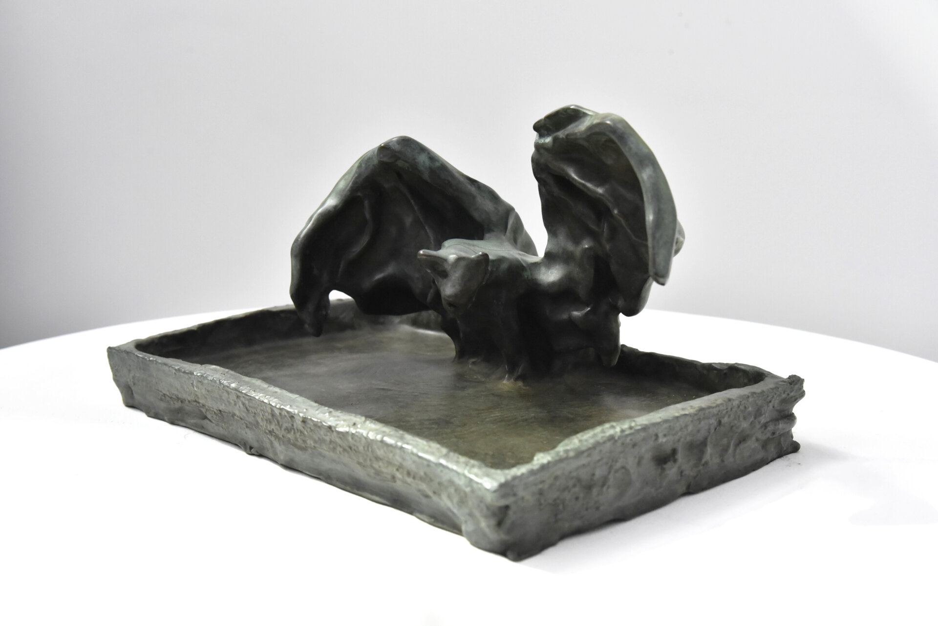 As in the fountain version, the sculpture retains its mythological character, but this time, the immobility of the bat on the water makes it even more enigmatic, open to multiple interpretations. This work continues to explore the themes of animality, transformation and mystery, while creating a visual tension between water and bronze.